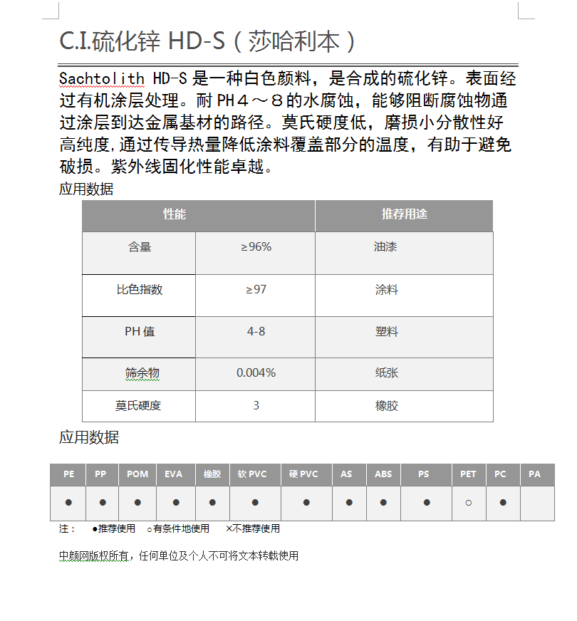 SACHTOLITH HD-S 硫化锌 (泛能拓) 尼龙玻纤