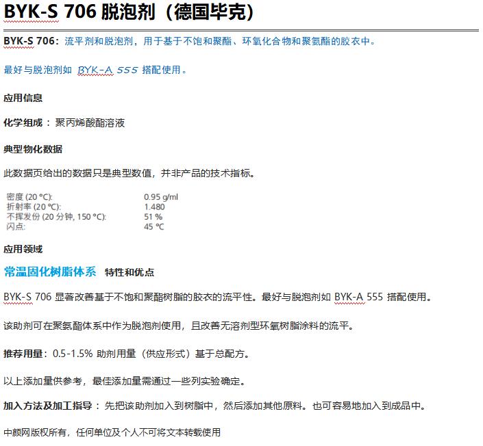 BYK-S 706脱泡剂(毕克S706脱泡剂)胶衣用流平剂 胶泡剂