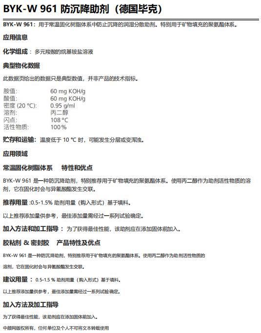 BYK-W 961防沉降助剂(毕克W961防沉降助剂)用于聚氨酯体系 胶粘剂