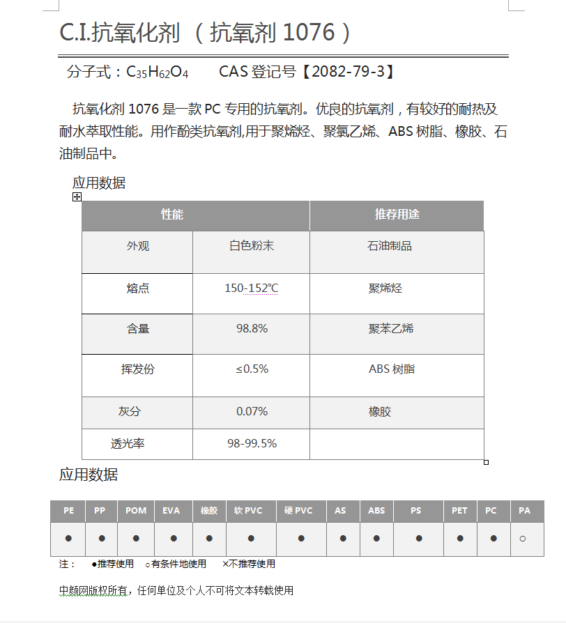 IRGANOX 1076抗氧剂 (巴斯夫1076抗氧化剂) PC应用