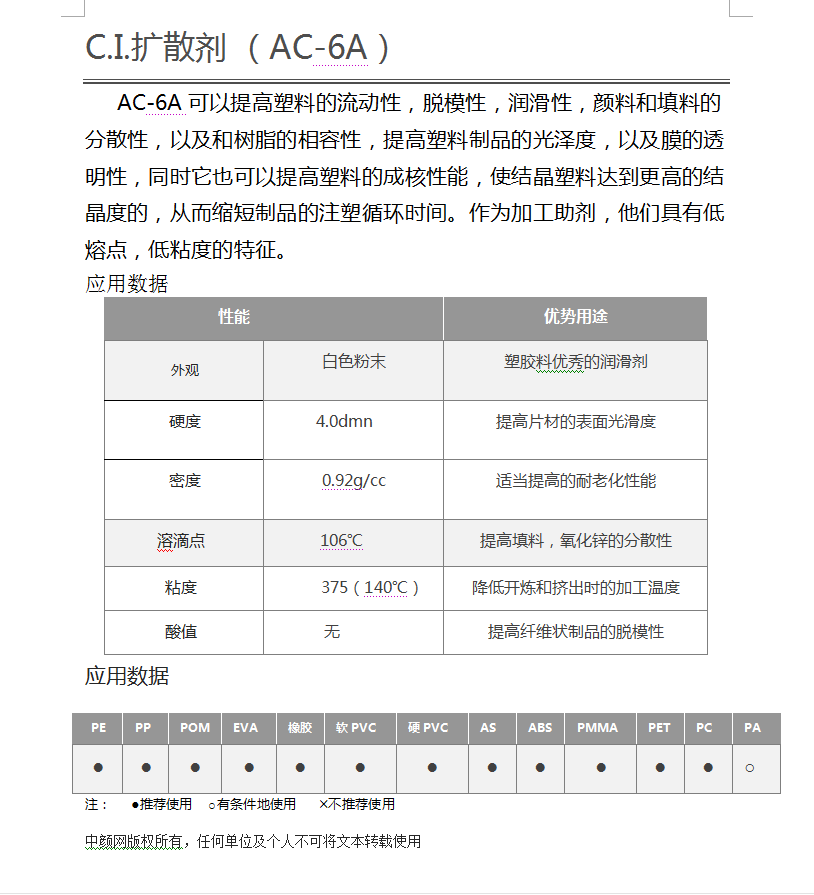 低密度非氧化 聚乙烯蜡 A-C 6A( 霍尼韦尔6A蜡粉)较高结晶度