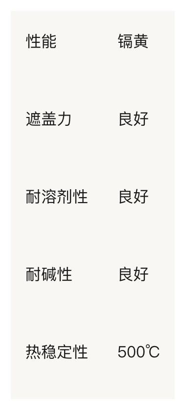 纯镉黄的化学组成为硫化镉或硫化镉与硫化锌的固溶体。硫化镉黄的常温稳定形态有两种:一种是α-CdS,属六方晶型;另一种是β-CdS,属立方晶型。前者称为高温稳定型,熔点1405℃,耐热性≥600℃。后者称为低温稳定型,耐热性≤500℃。在常温和500℃范围内,两种晶型的镉黄可以稳定型共存。镉黄不溶于水,碱,有机溶剂和油类,微溶与5%稀盐酸,溶于浓酸,稀硝酸。β-型比α-型的亲油性强。镉黄的研磨性好但耐磨性差。镉黄的着色力较强,耐光,耐侯性优良,不迁移,不渗色。