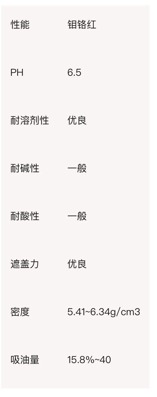 颜色:有橘红色至红色的各类品种。它的颜色鲜明,着色力高于橘铬黄。可与有机颜料一起使用,以扩大颜色的范围,同时提供良好的不透明性。
