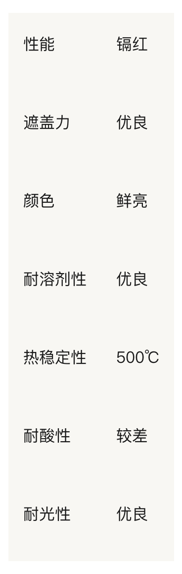 性状:红色粉末,为硫化镉与硒化镉的固溶体。颗粒形态基本为球形,其晶体结构主要为六方晶,也有立方晶型。具有良好的耐高温,耐碱,耐光和耐大气影响的性能,着色力和遮盖力亦很好。